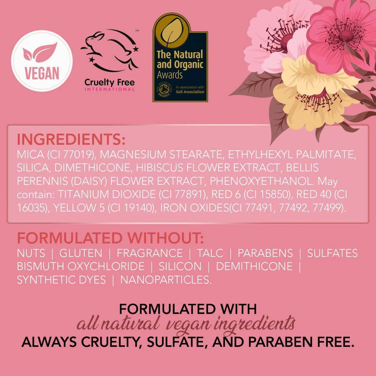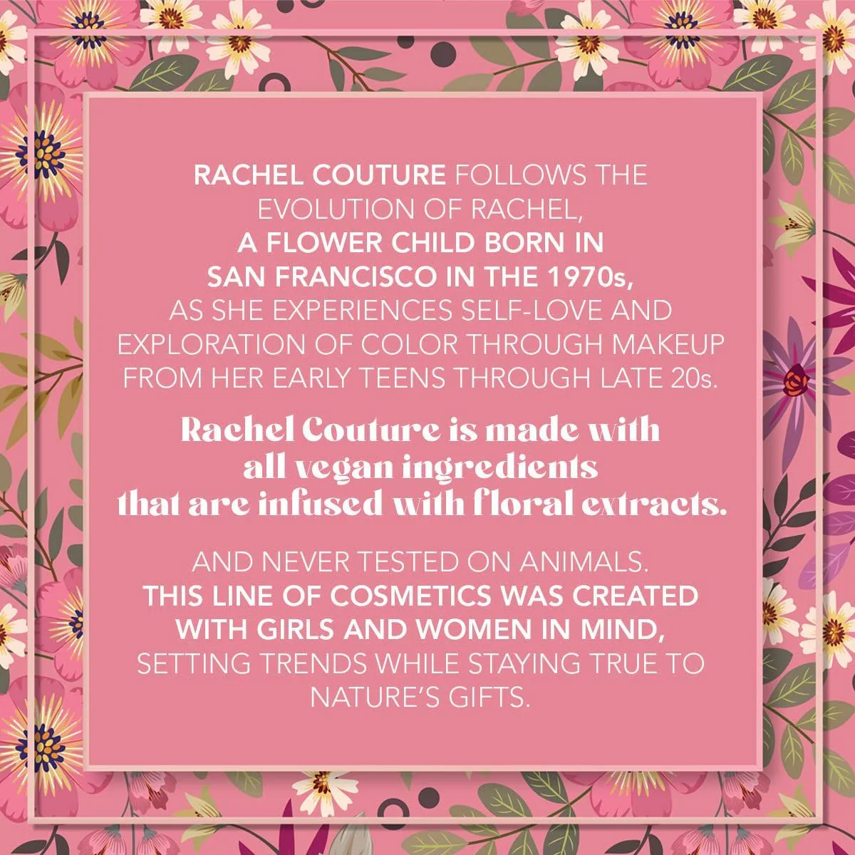 As with all Rachel Couture products, our eyeshadow palettes are made with the safest, natural ingredients, making them non-toxic and paraben free. In addition to being safe and healthy for your skin, they are also 100% vegan, cruelty free, and never tested on animals.
