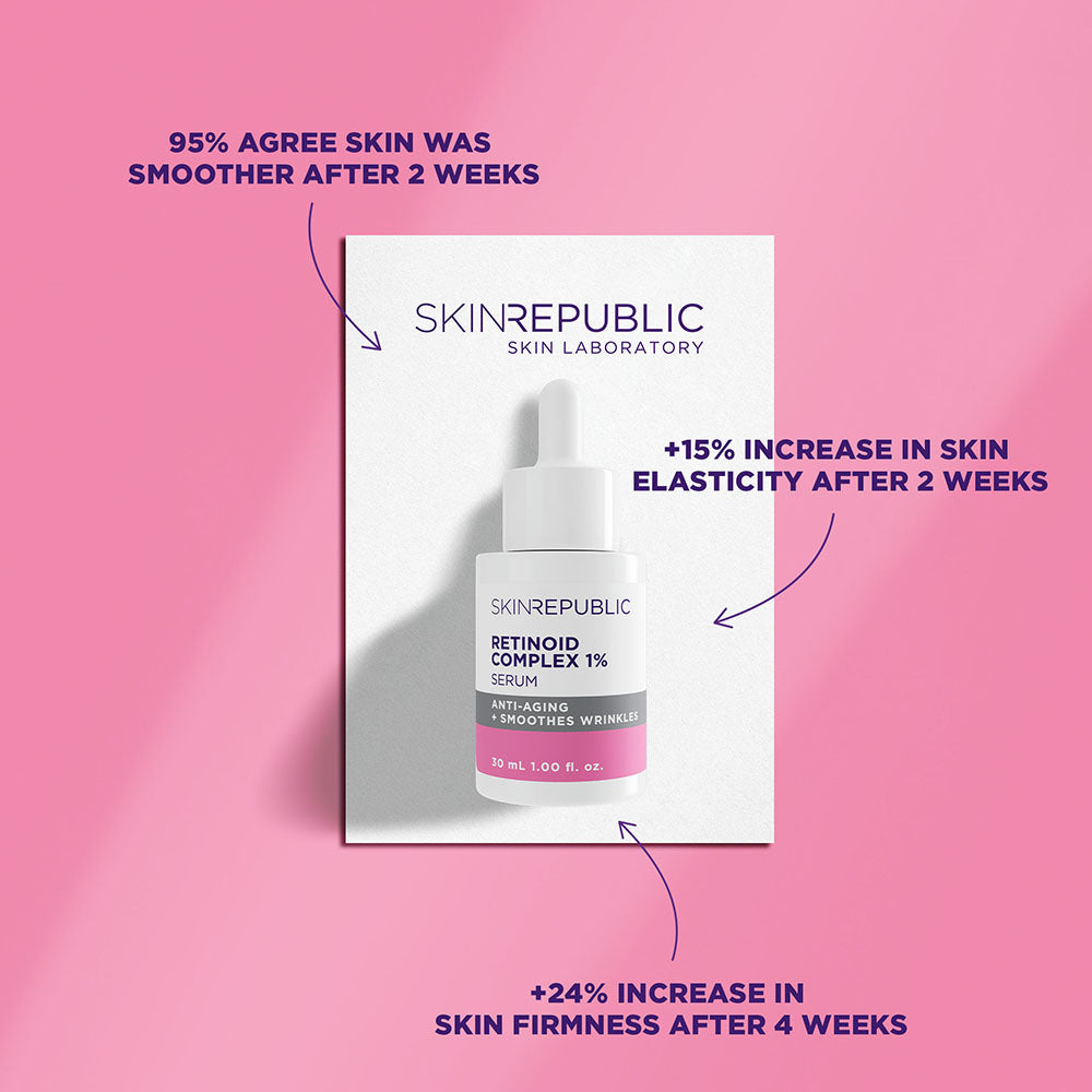 Anti aging serum infused with 1% retinoid complex combining retinol and retinyl palmitate. Suitable for sensitive skin.